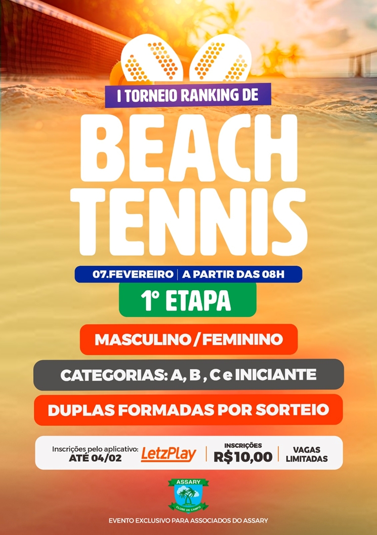 O Assary Clube de Campo dá início a uma nova fase do Beach Tennis com o 1º Torneio Ranking. A 1ª etapa acontece no dia 7 de fevereiro, a partir das 8h, reunindo atletas nas modalidades Masculino e Feminino, nas categorias A, B, C e Iniciante.