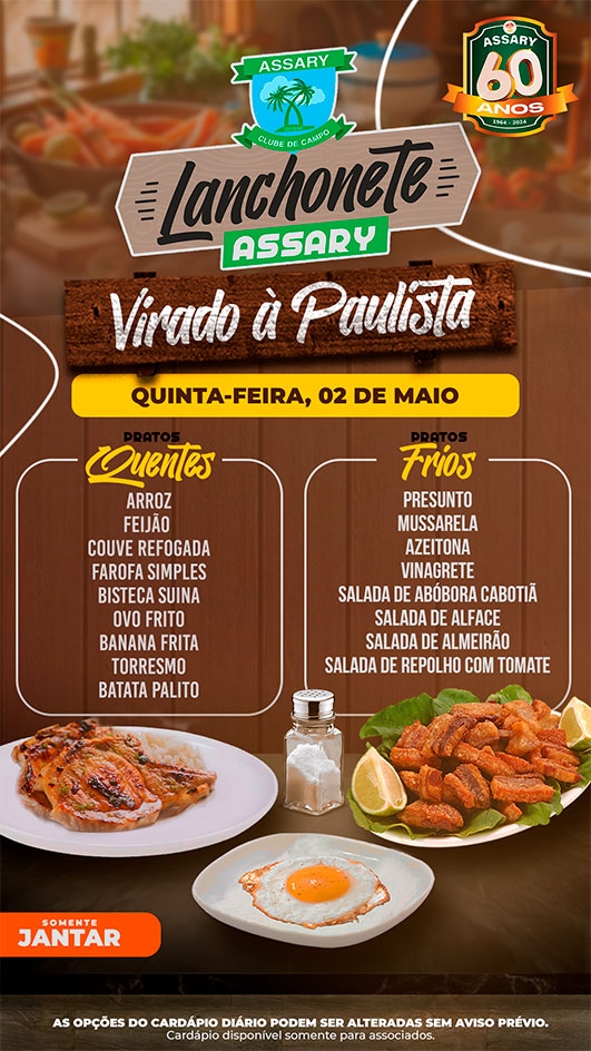 O Jantar está disponível a partir das 18:00h e caso deseje, pode estar levando e comendo no conforto de sua casa, lembrando que o atendimento acontece até as 22:00h, nos vemos lá!
